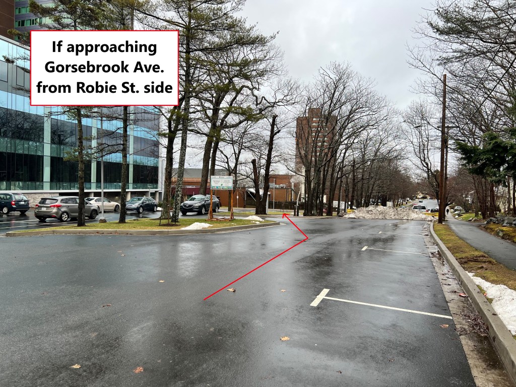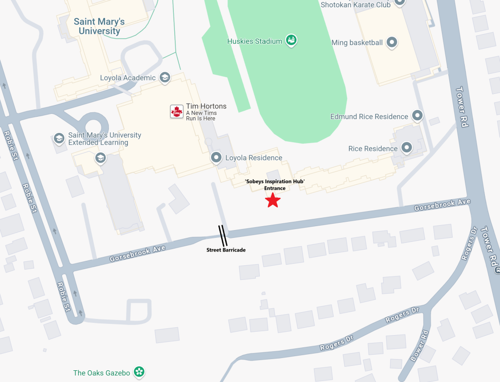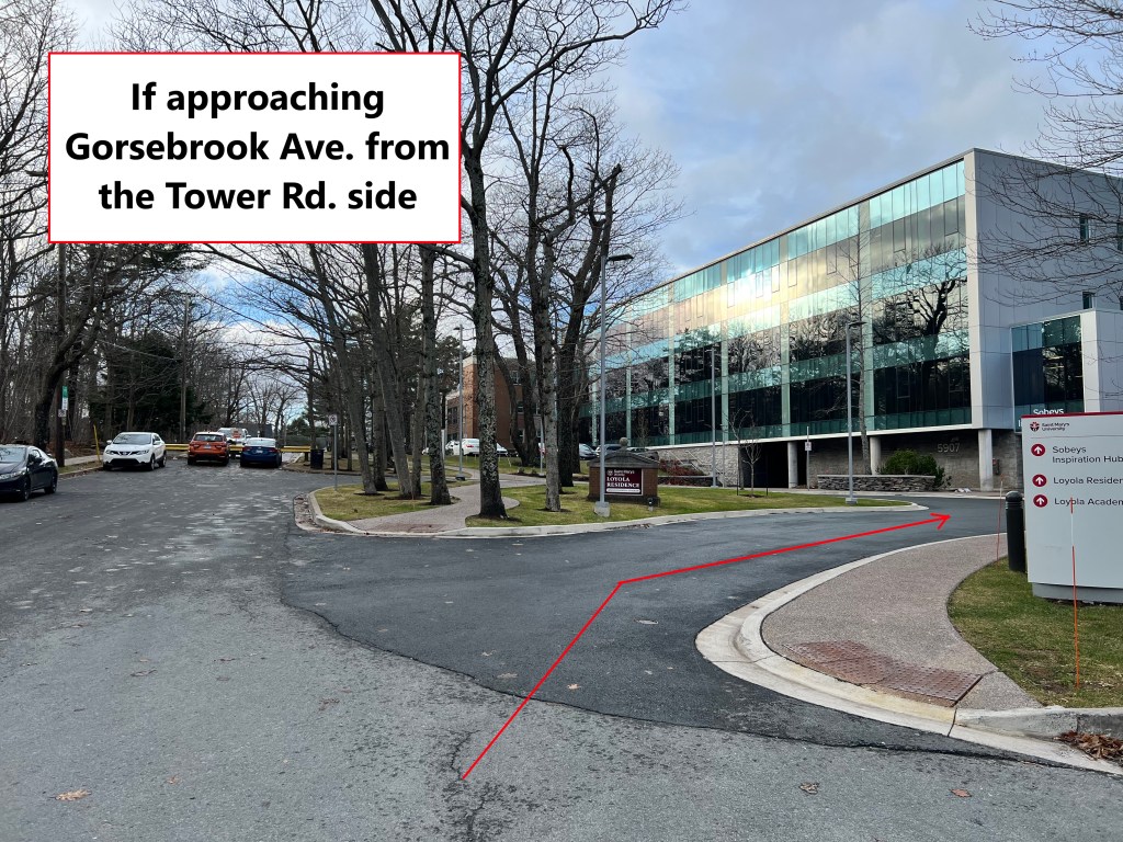 There is a street barricade halfway down Gorsebrook Avenue, and the Art Gallery entrance is located on the side accessible from Tower Road. You are not able to drive straight up to the entrance doors if you use Robie Street to access Gorsebrook Avenue.